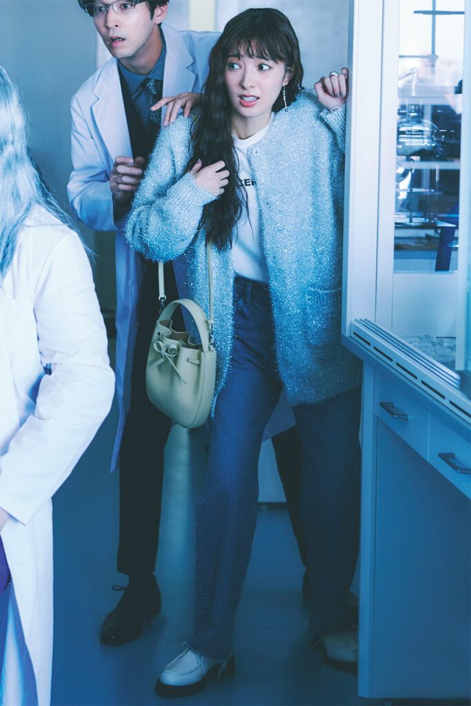 ロゴロンT着回し ラメニットカーデ¥39,600(THIRD MAGAZINE)ストレートデニム¥25,300(レッドカード トーキョー/ゲストリスト)バッグ¥44,000(ヴァジック/ヴァジックジャパン)シューズ¥33,000(銀座かねまつ/銀座かねまつ6丁目本店)イヤリング¥7,920(イットアトリエ/フォーティーン ショールーム)リング¥19,580(バルブス/ZUTTOHOLIC)