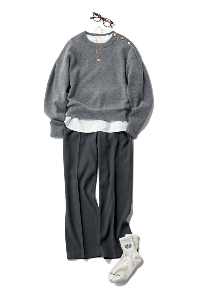 ロゴロンT着回し ニットトップス¥29,700(マルティニーク/マルティニーク ルミネ横浜)ストレートパンツ¥10,450(リリアン カラット)ソックス[3足組]¥1,760(フルーツオブザルーム/ギャレット)メガネ¥40,700(アイヴァン/アイヴァン 東京ギャラリー)ネックレス¥8,800(ベン・アムン/ZUTTOHOLIC)