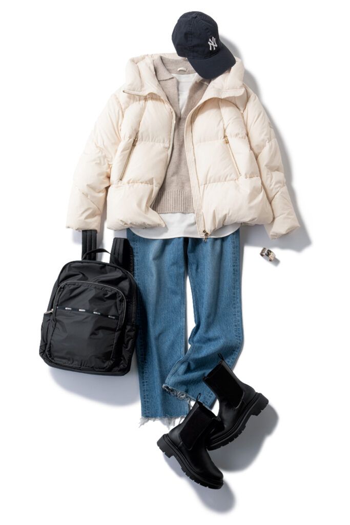 ロゴロンT着回し ポロニット¥2,490(GU)キャップ¥4,400(ニューエラ)ストレートデニム¥25,300(レッドカード トーキョー/ゲストリスト)白ショートダウン¥115,500(タトラス/タトラス コンセプトストア 青山店)リュック¥34,650(レスポートサック/レスポートサック ジャパン)ブーツ¥3,990(GU)バングル¥41,250(ノース ワークス/UTS PR)