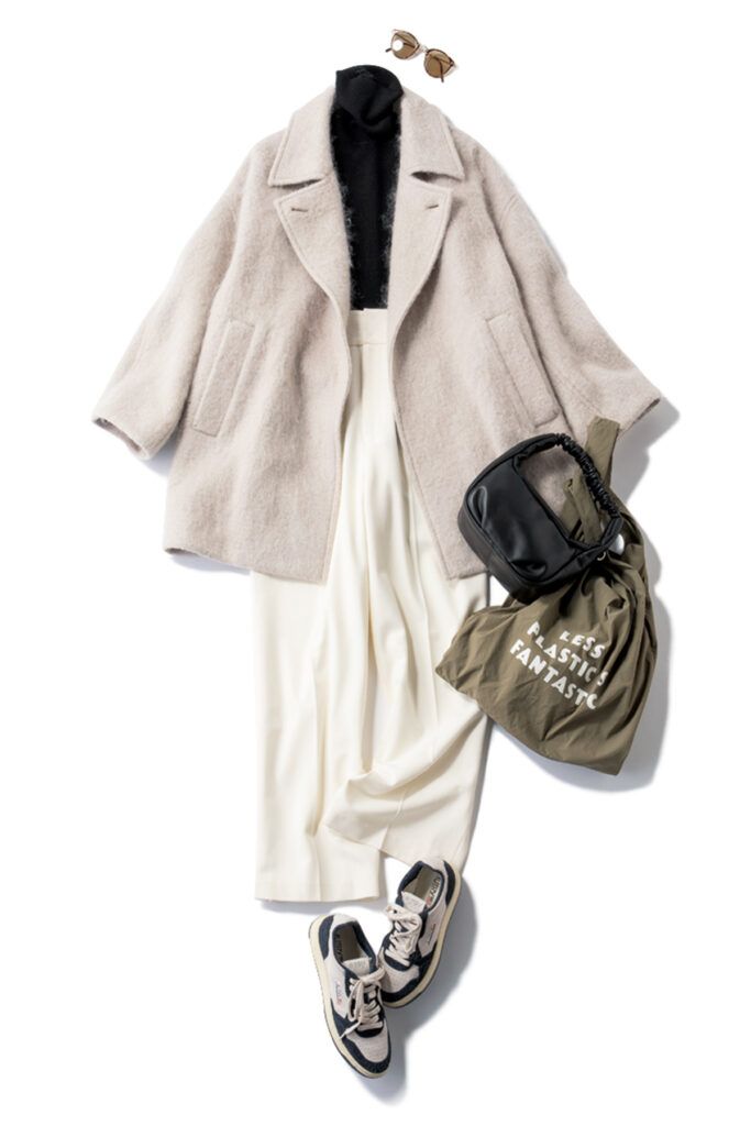 白ワイドパンツ着回し ミドル丈シャギーコート¥47,300(アダム エ ロぺ)黒リブタートルニット¥2,990(UNIQLO)黒バッグ¥7,700(カカトゥ/アンビリオン)エコバッグ¥3,300(ピルグリム サーフ+サプライ)スニーカー¥35,200(オートリー/トヨダトレーディング プレスルーム)サングラス¥52,800(アイヴァン/アイヴァン 東京ギャラリー)