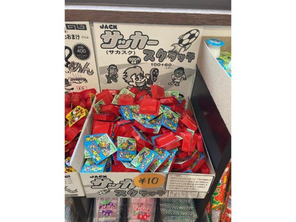 くじ付きお菓子の中で一番人気は「サッカースクラッチ」。1個10円で日本が対戦国に勝ったら最高100円分の駄菓子と交換できるくじ引きお菓子で、お店にくる子供たちは真っ先にこのお菓子を手にして他のお菓子を吟味するようです。私もサッカースクラッチに挑戦した結果…敗北(泣)しかし、くじ引き独特のドキドキワクワク感や懐かしさを味わえてとても楽しかったです。