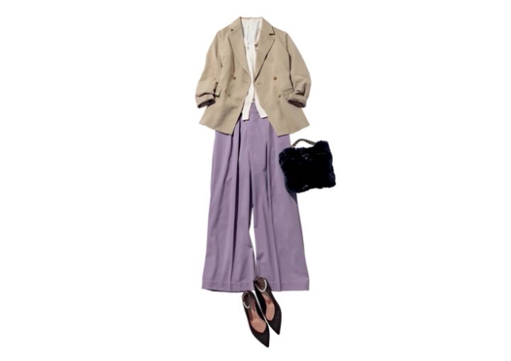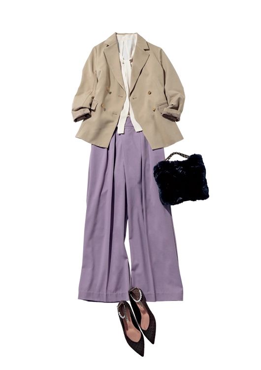 ジャケット+ボウタイの王道きちんとラッキーコンビで〝しごでき風〟に。ベージュジャケットとラベンダーパンツとの色なじみも絶妙です。