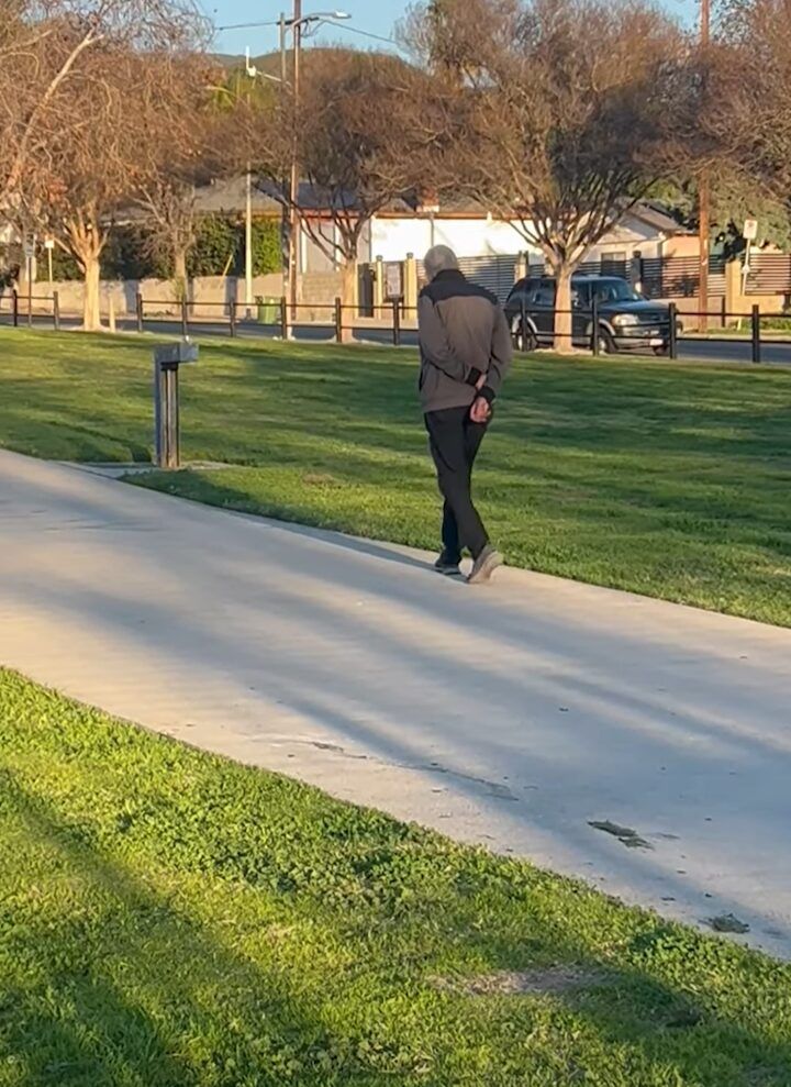 腰の後ろにで手を回した、少し独特な歩き方をしています。