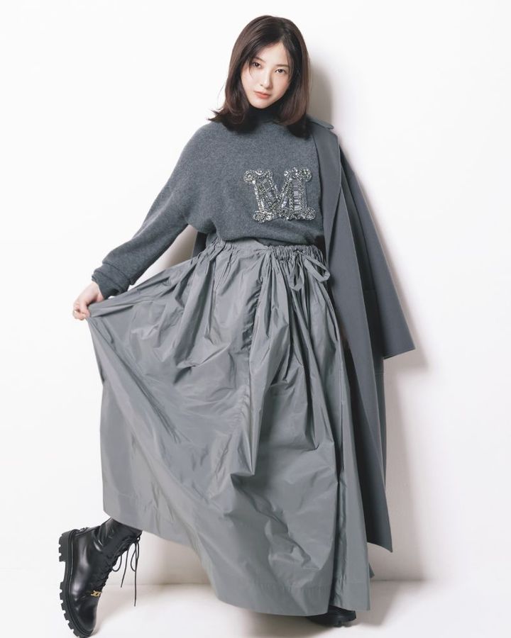 たっぷりボリューミィな甘口スカートは、シャカシャカ素材でカジュアル要素をプラスするのが今の気分。トップスは華やかな飾りつきニットを選んで、女っぽさを引き立てるのが好バランスです。トレンドのグレーでワントーンにまとめて、異素材MIXで抜け感を演出すれば、グッと上級者見え。足元はレザーブーツでモード感をプラスし、かっちり引き締めるのが正解です。