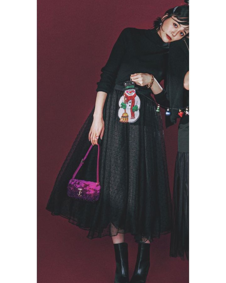 スカート¥35,200(エストネーション)ニット¥19,800(ユナイテッドアローズ/ユナイテッドアローズ 渋谷スクランブルスクエア店)バッグ¥379,500ブーツ¥147,400(ともにJIMMY CHOO)ヘアクリップ¥53,900(アレクサンドル ドゥ パリ/アレクサンドル ドゥ パリ GINZA SIX店)ピアス¥69,300リング¥477,400(ともにマリハ)ブレスレット¥3,780(アビステ)