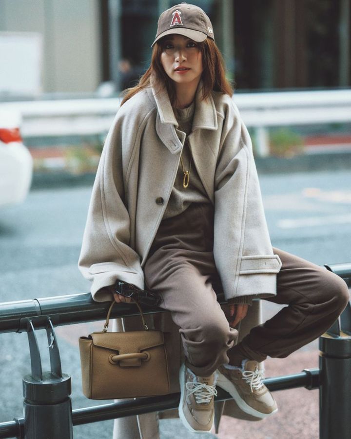 スウェットパンツ¥21,450(シグネ/RHC ロンハーマン)コート¥89,100(ニコラ ジェンソン/リノウン)ニット¥34,100(ザ シンゾーン/シンゾーンルミネ新宿店)キャップ¥4,400(ニューエラ)バッグ¥55,000(ヴァジック/ヴァジックジャパン)ソックス¥1,210(靴下屋/タビオ)スニーカー¥46,200(デイト/ティースクエア プレスルーム)ネックレス¥33,660(ソコ/ZUTTOHOLIC)