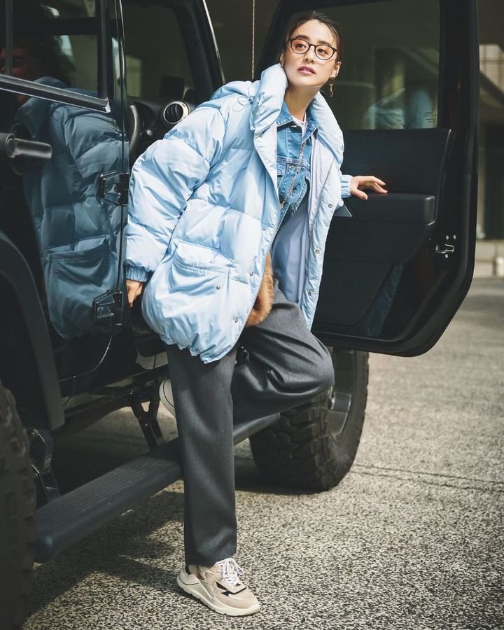 防寒重視で「ダウンジャケット」を羽織るものの、オシャレに着こなすのが難しい、という人も多いはず…。そんなときは、「カラーダウン」に頼って華やかさと上級者見えを狙って。調整役にデニムジャケットを重ね着してカジュアル要素を加えつつ、色の濃淡をつけて奥行きを演出。真面目なグレーパンツが休日モードに着崩せれて好相性です。