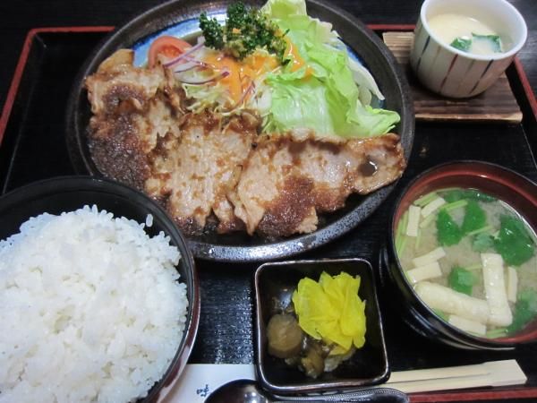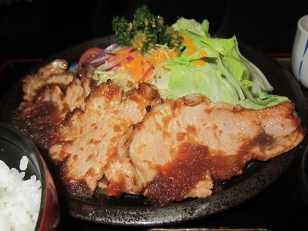 焼肉定食。大きな豚肉がど~~んとお皿にのってますよ~。美味しいタレがたっぷりで、ご飯がすすみます。こちらにも、大盛りご飯、茶碗蒸し、お新香、お味噌汁がついています。