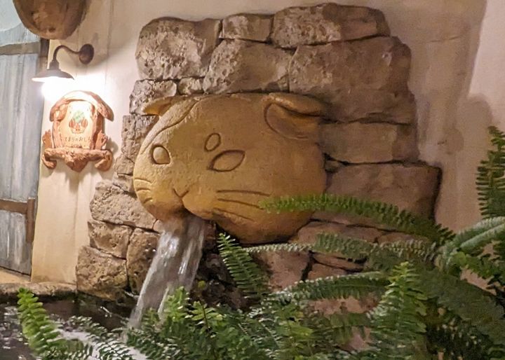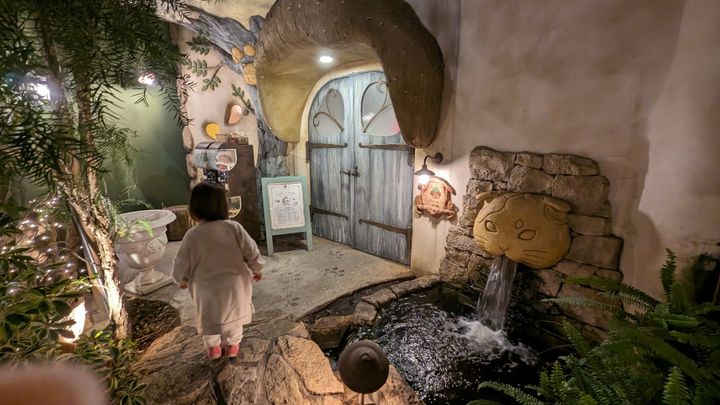 絵本の世界に迷い込んだみたいな猫を模した建物に大人もときめく空間です!ギャラリー/猫カフェ/雑貨店などが入った複合施設で、お店は子どもが触ると危険なものがあるので建物内の猫の噴水や流れる小川、壁にある開かないドアのノブを引いてみたりと空間を楽しむスタイルで訪問しましたが、それだけでも娘は「猫さんいた!」とあちこちにいる壁の猫に大はしゃぎして何度も行ったり来たりしていました。