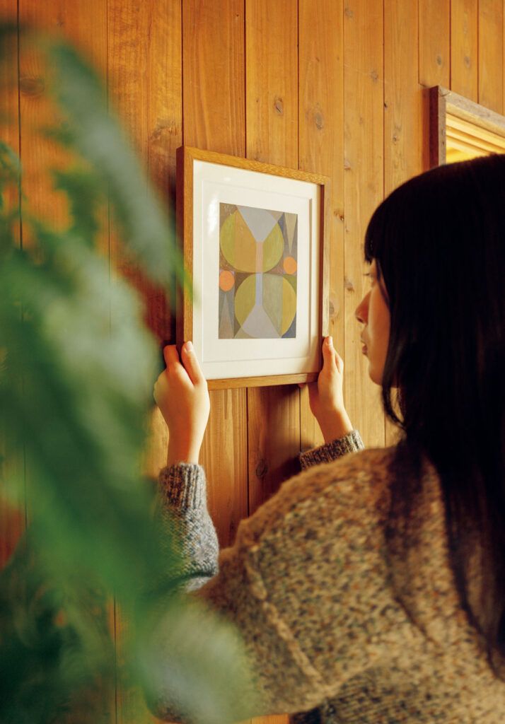『プレイマウンテン』で見つけた、 “All flourishing is Mutual”(すべての繁栄は相互的である)とタイトルが付けられたペインティング。ニュージーランド生まれの作家、アーロン・グラッソンの作品だ。昨夏にインドネシア・バリ島で過ごした際に、広大な自然に思いを馳せて制作したものだという。「原初的でありながら現代的、さらには未来的でもあるような作品であるよう制作を心がけました」とはアーロンの言葉。¥90,200(プレイマウンテン 03−5775−6747)ニット¥47,300(A.P.C./アー・ペー・セー カスタマーサービス 0120−500−990)