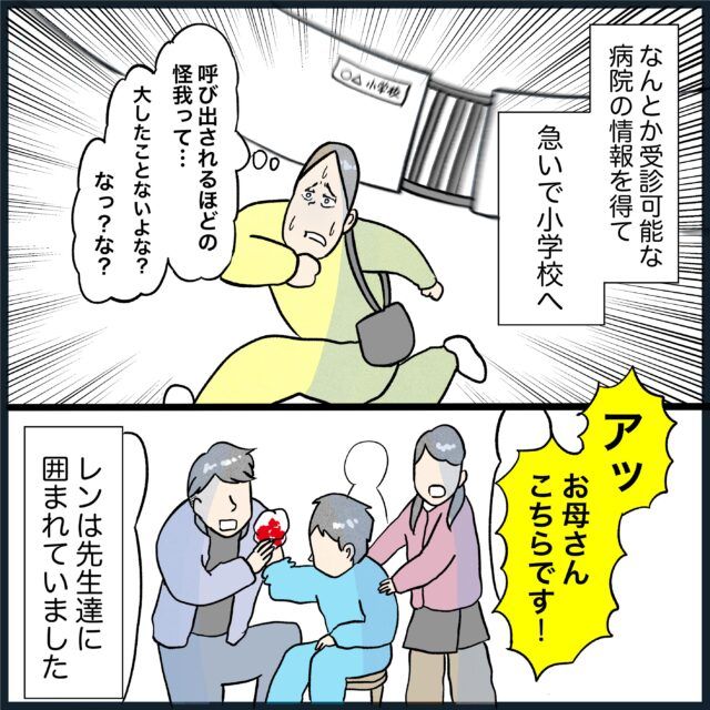多少の擦り傷や切り傷はよくあることですが、呼び出されるほどの怪我となると心配ですね。レンくんの傷を目の当たりにしたはんままさんの表情・・・かなりショックを受けているようですね・・・。