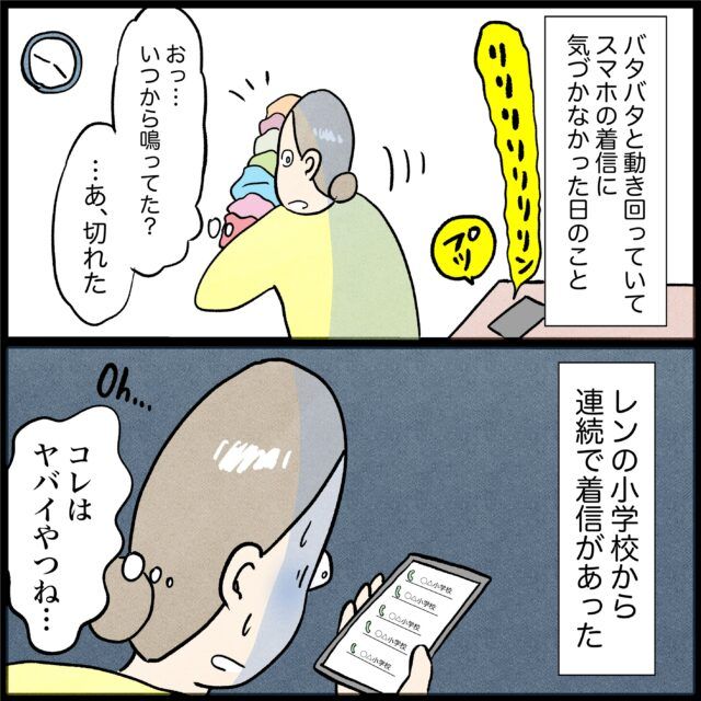 9歳長男レンくん、6歳長女スイちゃん、3歳次男ヨウちゃん、3人のお子さんのママであるはんままさんから、レンくんが学校で大けがをしてしまったときのお話です。ある日、自宅で家事をしていたはんままさんはスマホの着信音に気付き、画面を見ると小学校からの着信がずらり。「コレはヤバいやつ」と思いながら折り返しの電話をかけると・・・。