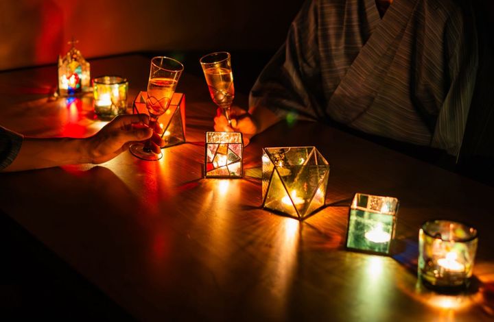⾷事処はプライベート感が保てる半個室で。卓上には多様な形のステンドグラスのキャンドルホルダーを設え、特別な時間を演出してくれます。プランには乾杯のドリンクも付いていて至れり尽くせり。