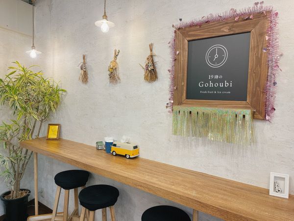 19時のGohoubiは関西圏に4店舗あります。「19時のGohoubi」という店名の由来は、 ”夕食後のデザートの時間は、19時くらいかな?” ”お父さんやお母さんの疲れを癒す育児のご褒美になればよいな” という想いから、「夜の7時」と「育児」という意味が合わさったこの店名になっているそうです。