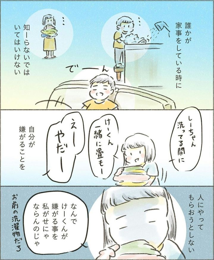 せせらぎ(@seseragi0822)さんは夫と死別し、小4・小2の2人の男の子を育てるシングルマザー。以前から2人の息子には少しずつお手伝いをさせていたと言いますが、ある日せせらぎさんは、物理的に無理な家事以外「すべてこの1年でできるようにさせる」と宣言したのです。子どもたちには子どもたちの、自分には自分のやるべきことがある。だからこそ「家事は3人でしたい」と言うせせらぎさん。分担することで、せせらぎさんは自分の時間が増えストレスが減るそう。家族みんなが、だれかが家事をやってくれるのを当たり前と思わず、自分にもできることはないか考えるきっかけになればよいのですが…。『子供達と家事』第6話をごらんください。