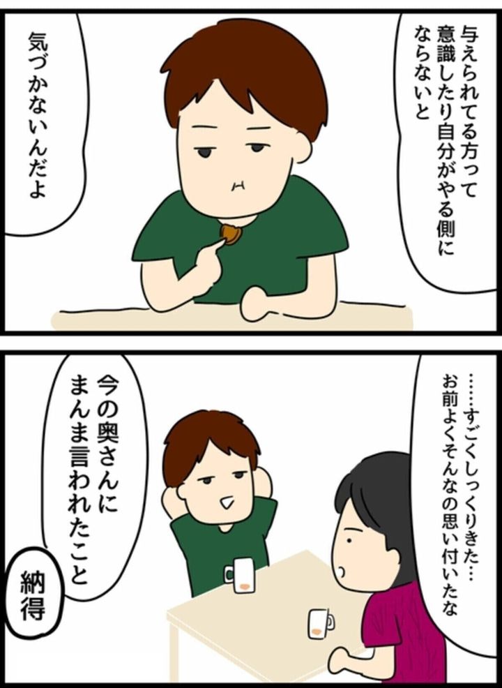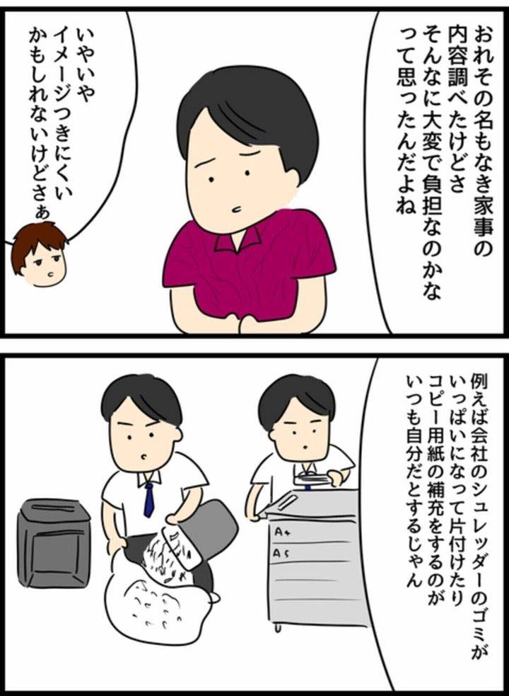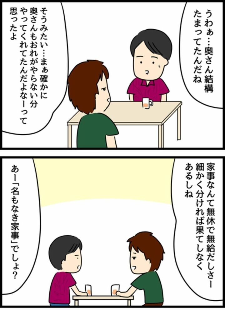 夫婦ではけんかになってしまうことやうまく伝わらないことも、友人からだとすんなり受け入れられるというのは不思議ですが、エスオ君が名もなき家事ややってもらうことが当たり前ではないことに気付いてくれて良かったですよね。