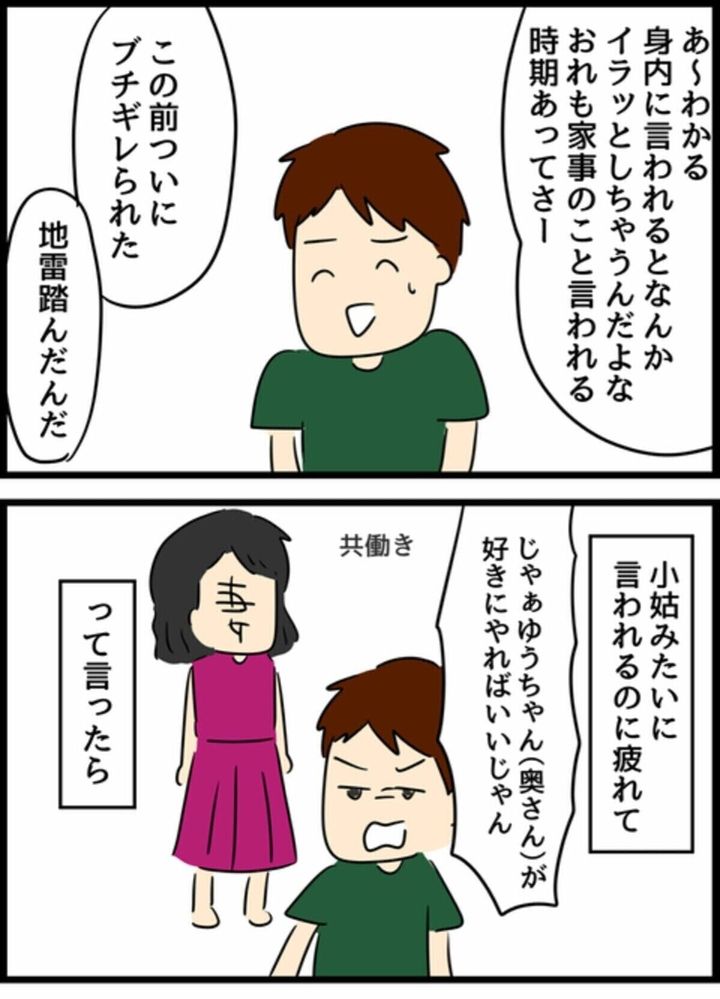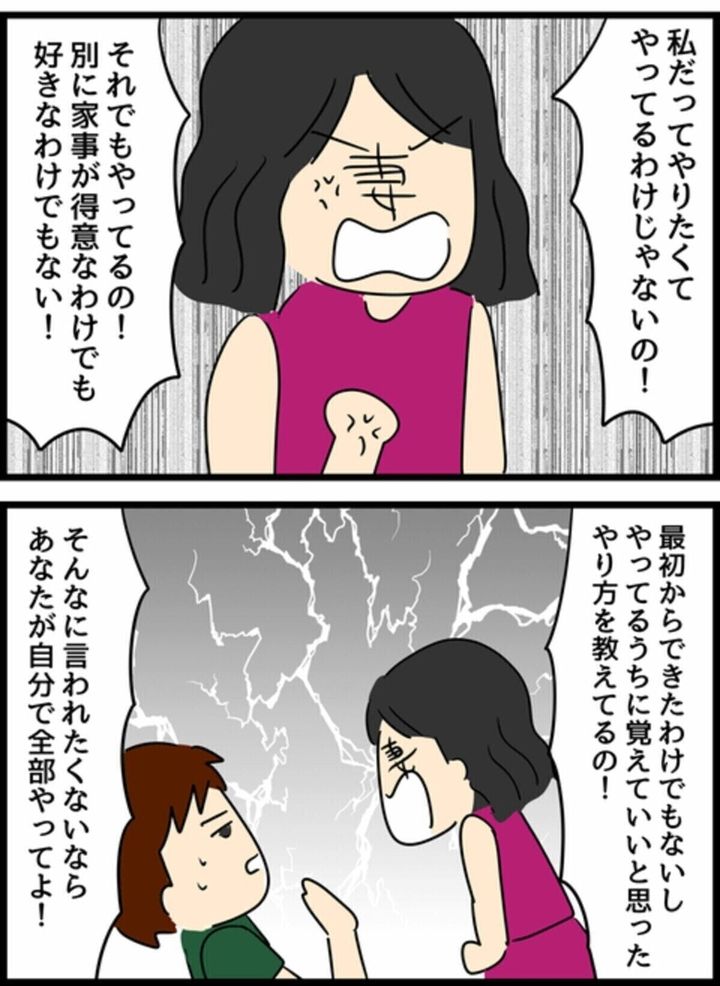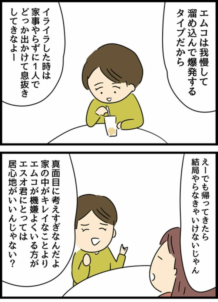 エスオ君が家事についての愚痴を話すと友人は自分たち夫婦のとあるけんかの話をしてくれました。「好きにやればいい」と言った友人に対し妻は怒り「最初から最後まで全部自分でやって!」と怒鳴ります。その剣幕に押され、思わず謝罪した友人。よほど溜まっていたものがあったのでしょうね…。