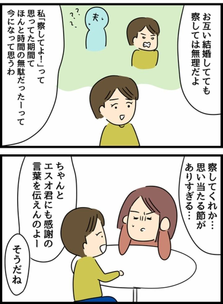 一方のエムコは友人から「察してなんて時間の無駄。エスオ君にも感謝の言葉を伝えること」という話をされます。気持ちを言えばいいとはわかっていながらも、つい言わずとも察してくれるのではと期待してしまうものですよね。しかし、もともと他人である2人が同じ空間で生活するうえでは察してもらうのはかなり難易度が高いようです。