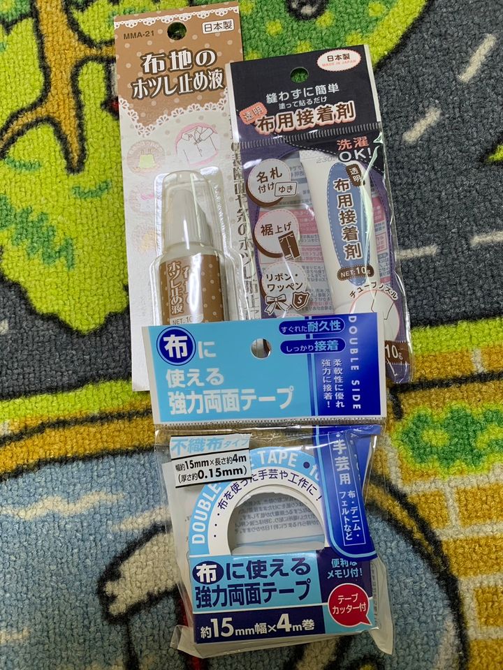 そして、あとは100円ショップで、布のほつれ止め液、布用接着剤、布に使える両面テープを買いました。