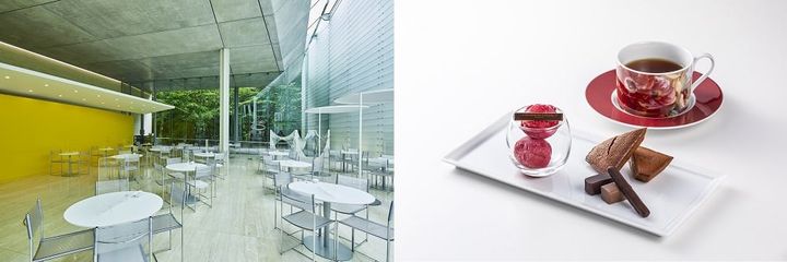 鑑賞後は、館内にある開放感たっぷりの「カフェ チューン」へ直行! 「モダン・タイムス・イン・パリ 1925」の開催期間中、数量限定でパリのチョコレート専門店「ラ・メゾン・デュ・ショコラ」とのコラボスイーツ「イニシアシオン メゾン」が楽しめます。2種類のボンボン・ドゥ・ショコラとオランジェット、フィナンシェ、ソルベのセットプレート。窓外に広がるグリーンを眺めつつ、パリ仕込みのスイーツを召し上がれ!