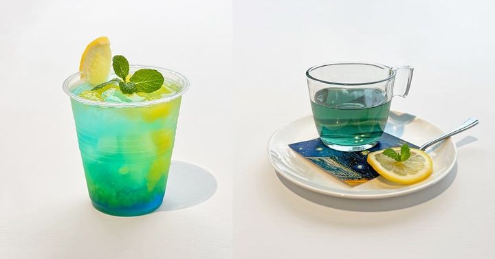 写真左:「星月夜の星屑カクテル」(900円)/写真右:「夜のカフェ・テラス トワイライトホットティー」(800円)(画像:ゴッホ・アライブ東京展実行委員会リリース)