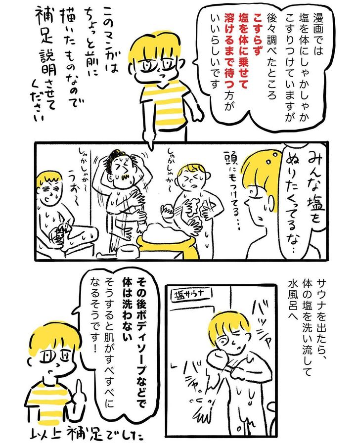 さらに、外のかけ湯で体を洗い流すと、肌がスベスベに…!その後、入り口にあった貼り紙やネットで塩サウナについて調べる中で、その奥深さに感心するミヤギトオルさんでした。