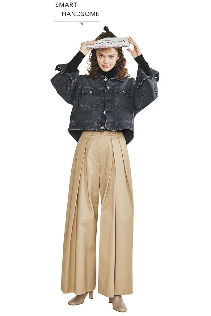 ハイウエストのボトムを合わせれば、自動的に腰位置も上がって、脚長スタイルを実現。プリーツによって広がりが増し、スカート見えするハリ感ワイドで、どんな体形にもマッチ。さらに足元までつなげるベージュのブーツで一体感を。