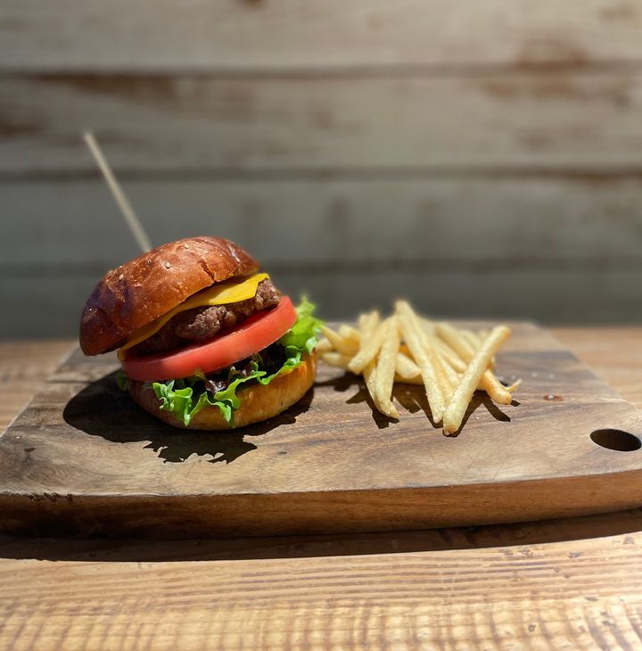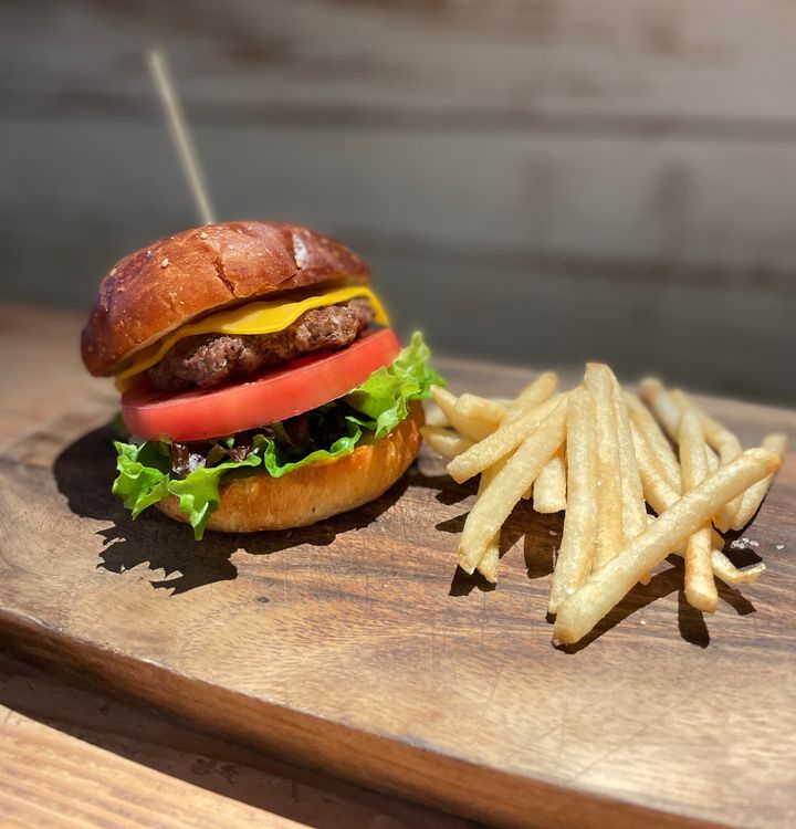 牧草牛100%パティ、チェダーチーズ、レリッシュ、トマト(¥1,800-)