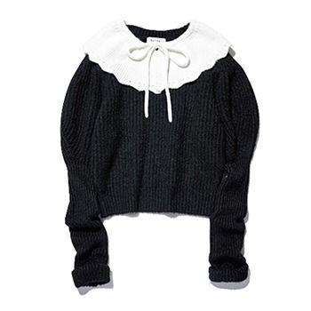 えりつき黒ニット 9,900円/RANDA 取りはずしできるフリルのえりで、ブラウスのようなルックスに。すべてニット素材だから緊張感が出ない。