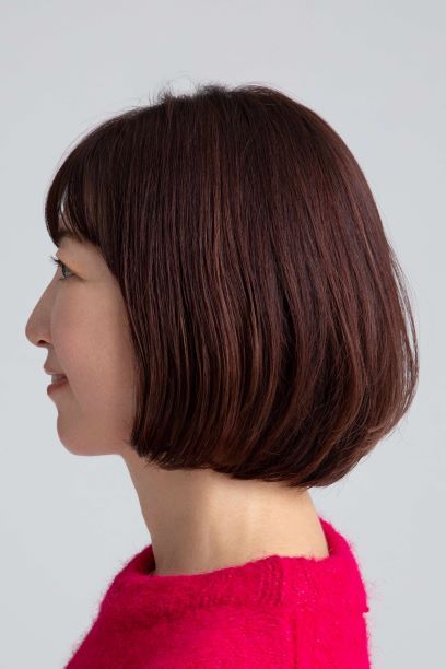 髪が乾燥しやすく、シルエットがモワッと広がりやすいと悩むGLOWかがやき隊の垂井さん。そこで、レイヤーをほとんど入れない平行ボブにして、コンパクトなミニボブ風にカット。重めの顎レングスにすることで、余計な膨らみが落ち着きました。「中間~毛先はストレートアイロンで整えて、ツルンとした質感にします。ほんのり内側にクセ付けすると爽やかな雰囲気に。パツンと揃えた前髪を合わせ、コンパクト感を高めれば今っぽいです」(武田さん)