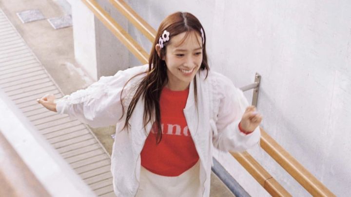 白ナイロンジャケット(3月発売予定) 14,850円/merry jenny 赤ロゴニット 8,980円/Katrin TOKYO レザーミニスカート 4,399円/Figments お花ヘアピン(4本セット) 1,980円/POTETE
