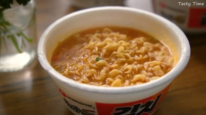 スープがよく絡む細麺タイプ。唐辛子の効いたさっぱりめのスープが辛旨です。韓国ではフタを折りたたんで容器を作り、その中で麺を冷まして食べることもあるそう。真似してみるのもいいかもしれません。