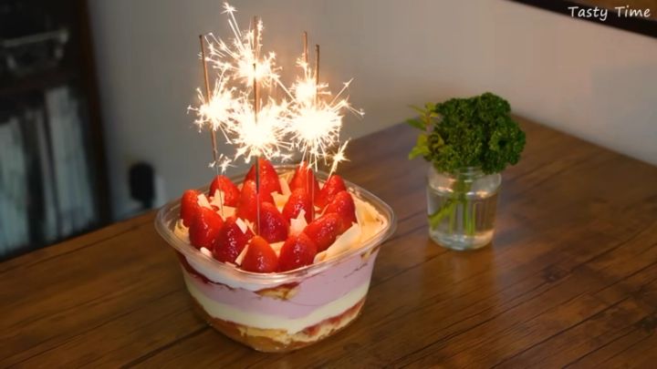 ラズベリーマスカルポーネやスポンジ、ストロベリーソースが全部で7層になっており、いちごとホワイトチョコがトッピングされています。華やかなので花火やろうそくを指してそのままお祝いケーキにするのもよさそうです。