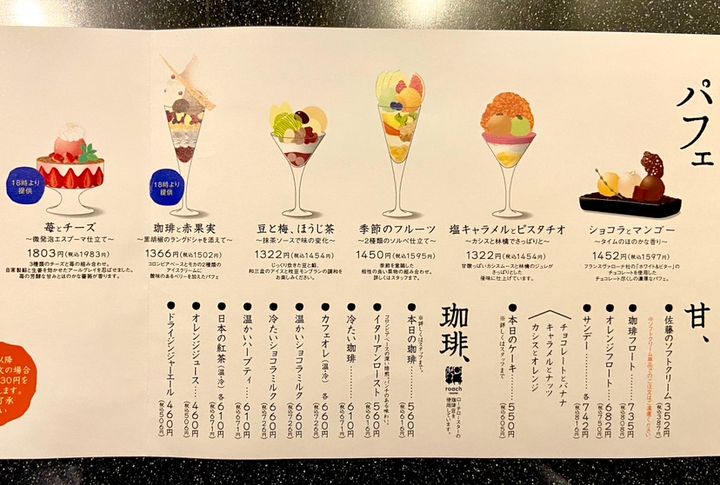 お酒や珈琲、パフェもそれぞれお好きなものを選ぶことができます。