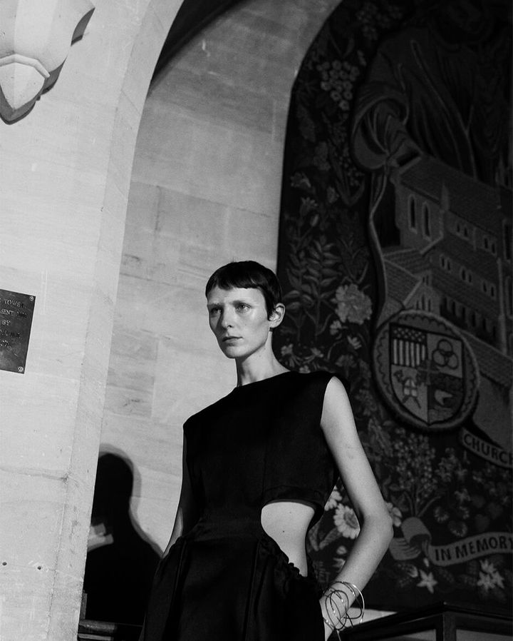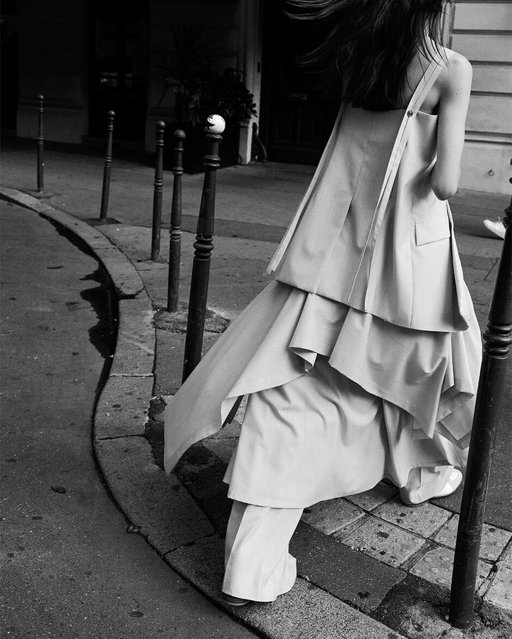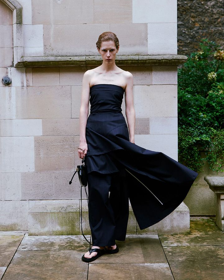コレクションでは、アシンメトリックフレアのベアトップドレスやハンカチーフヘムのティアードスカートなど、独創的なフォルムでありながらボディに美しくなじむウェアを展開。