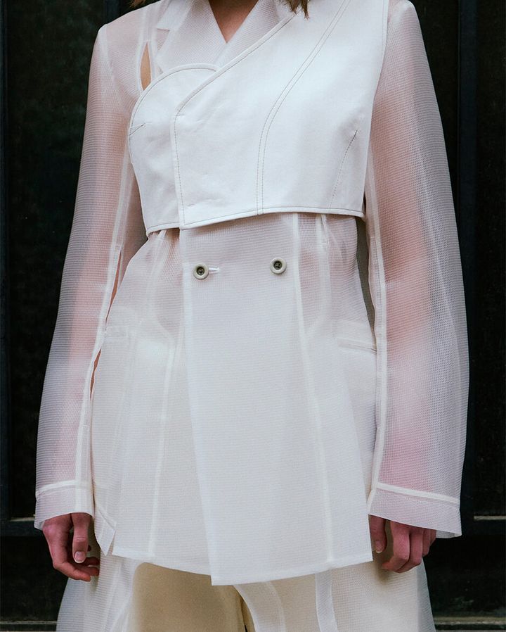 新たなテクスチャーも登場し、ポリエステルと和紙を交織したダブルサテンやブライトナイロンのワッフル素材などが、透明感と光沢と共に構築的なシルエットを形成する。