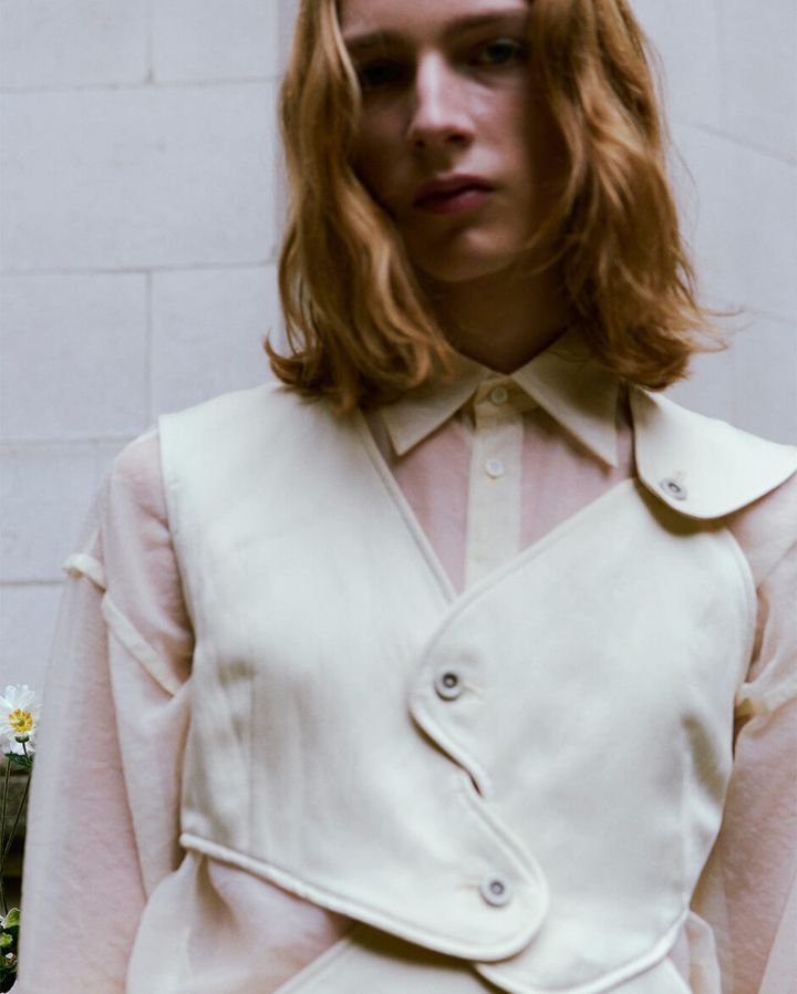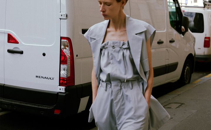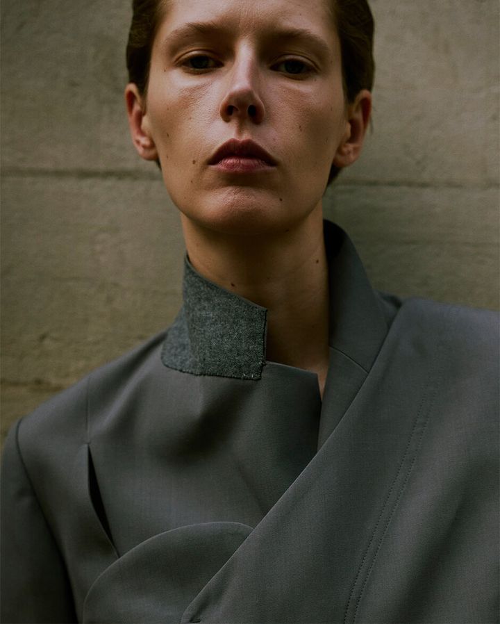 メリハリのある「UJOH」ならではのテーラーリングが、街の内包する陽光や陰翳、風に呼応しながら人物のシルエットを形作るさまを通じて、景色の中で生まれる反応が描き出された。