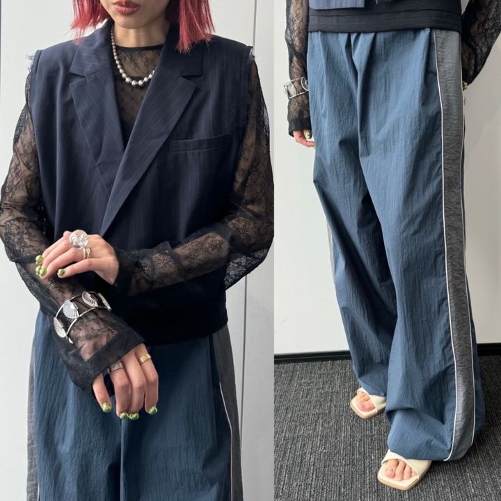 「クロップト丈のジレとトラックパンツを合わせました。スポーツとモードという対極するアイテムを組み合わせてレーストップスやビスチェ、ヒールサンダルで女性らしく着こなしました。パンツにボリュームがあるので、トップスはコンパクトにまとめてバランスよく着こなしました」