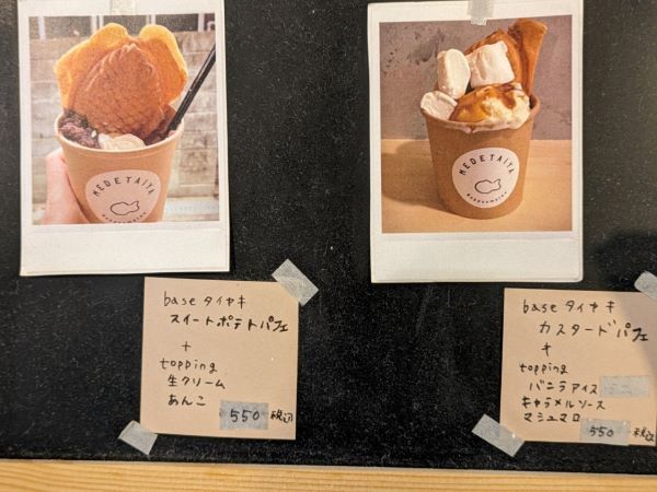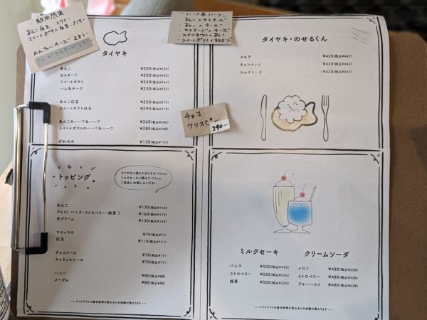 さてさて、このカフェ、名前からもお察しできるように、「タイヤキ」専門のカフェなんです。タイヤキは最近流行っていていますが、タイヤキを専門としているカフェは珍しいですよね。カフェらしく、イートイン限定でお皿にサーブしているタイプのものや、定番のものに加えて、トッピングの種類も多いので、本当に迷ってしまいます。トッピングの組み合わせは自在なので、メニューの種類は無限大です!