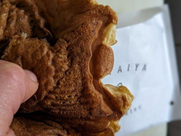 一気に食べても良かったのですが、ここはあえて残りを家で食べることにしました。というのも、MEDETAIYA 六本松の生地は、冷めても硬くなりすぎないのが特長なんです。通常の生地は、冷めると硬くなりすぎるために、ハネを切り落とすのが一般的なのだそうですが、こちらの生地は時間が経って冷めてもしっとりと美味しく食べられるようにと、考えられた生地とのこと。トースターで温めれば”カリッ”となりますので、お好みでどちらでも楽しめるという、嬉しいタイヤキです。