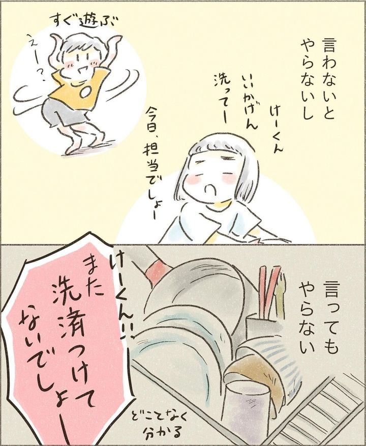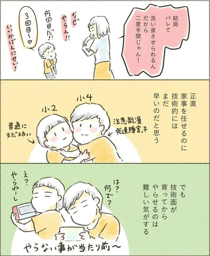 せせらぎ(@seseragi0822)さんは夫と死別し、小4・小2の2人の男の子を育てるシングルマザー。以前から2人の息子には少しずつお手伝いをさせていたと言いますが、ある日せせらぎさんは、物理的に無理な家事以外「すべてこの1年でできるようにさせる」と宣言したのです。せせらぎさんは二人の息子に手伝いをさせていますが、家事レベルはまだまだだと言います。言わないとやらないし、言ってもやらないときもあるそうですが…。『子供達と家事』第7話をごらんください。