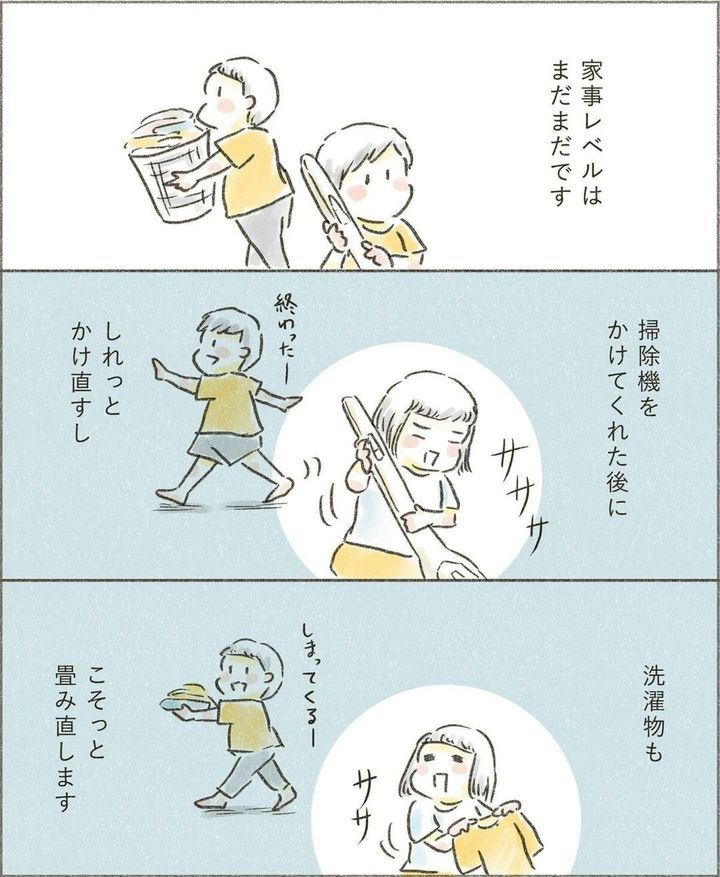 このお話の主人公・せせらぎさんは、夫との死別を経験しています。命あるものとの別れはいつ訪れるかわからない、ということを切に感じているからこそ、「もしも自分がいなくなっても、子どもたちが生活に困らないように」と小さいころから家事を教えているのだそう。