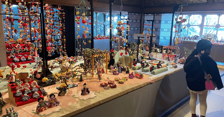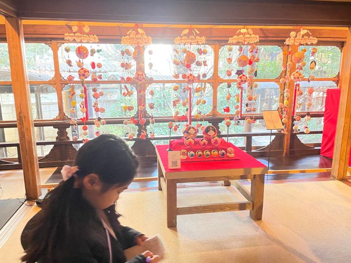 伝統的な雛人形だけでなく、猫の雛人形展があるのも子どもが喜ぶポイントでした。様々な素材や表情のネコ雛人形があり、娘は写真を撮ったり、作品の名前のメモをとったりして堪能していました。様々なつるし飾りやテマリによる空間演出も華やかで、おうちに帰ったら私も作ってみたい!と大興奮でした。
