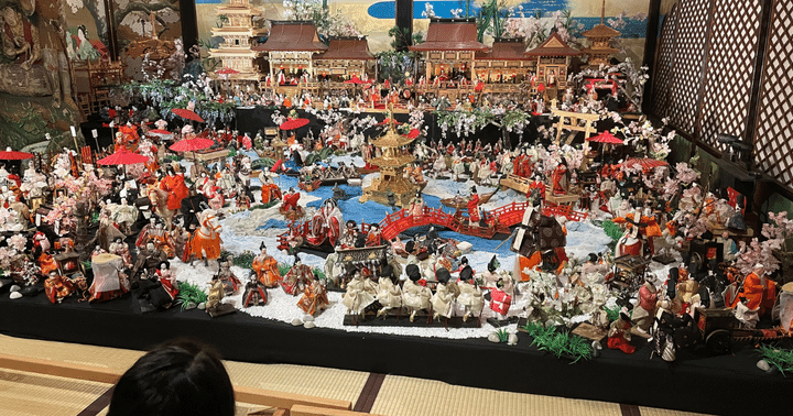そして中でも特に感動したのが、「座敷雛」です。雅な平安絵巻をテーマにした雛人形が集まった「座敷雛」が座敷いっぱいに広がり、圧巻のスケールでした。娘もお雛様がいっぱいいる!橋の上を渡ってる人がいる!と大興奮!