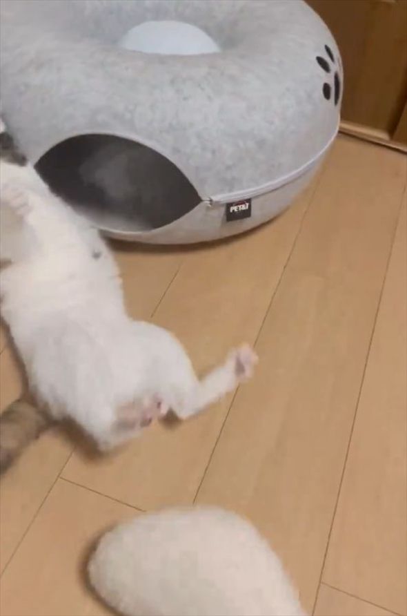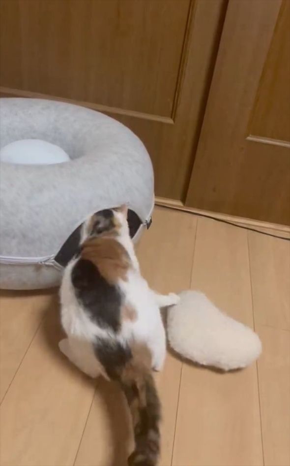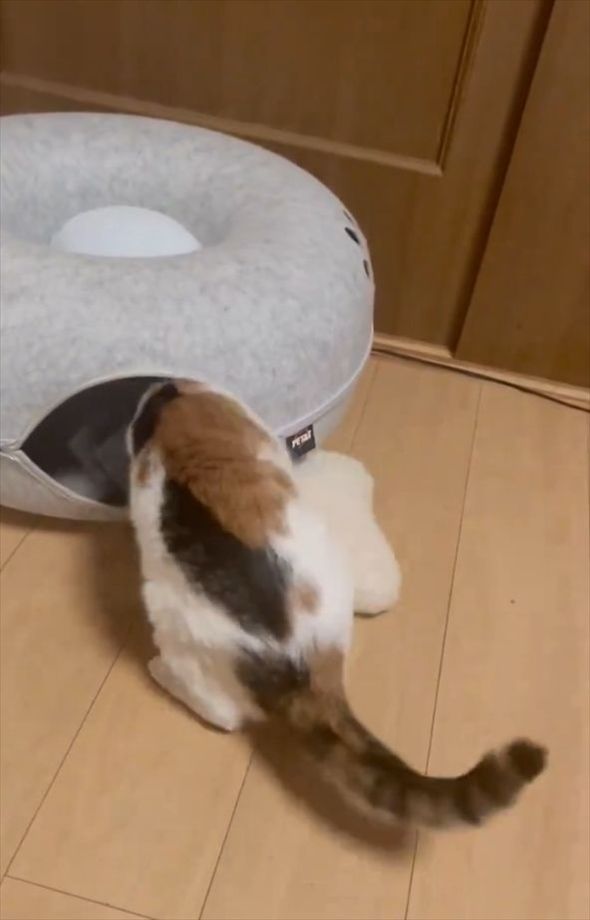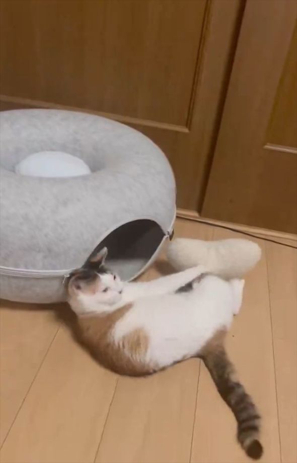 ご紹介するのは、ここべ(@b9vqnfDqqh5hHY4)さんがXに投稿された動画です。 愛猫の『ナゴミ』ちゃんがオモチャを運ぼうとしている姿を捉えた映像です。