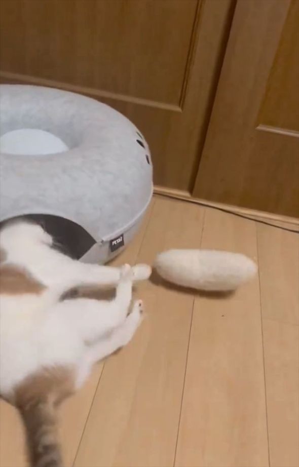 3. お気に入りのオモチャを自分の部屋に運びたい猫。悪戦苦闘する姿に「開始5秒の空をかく前足に爆笑」「無限に見ていられます」