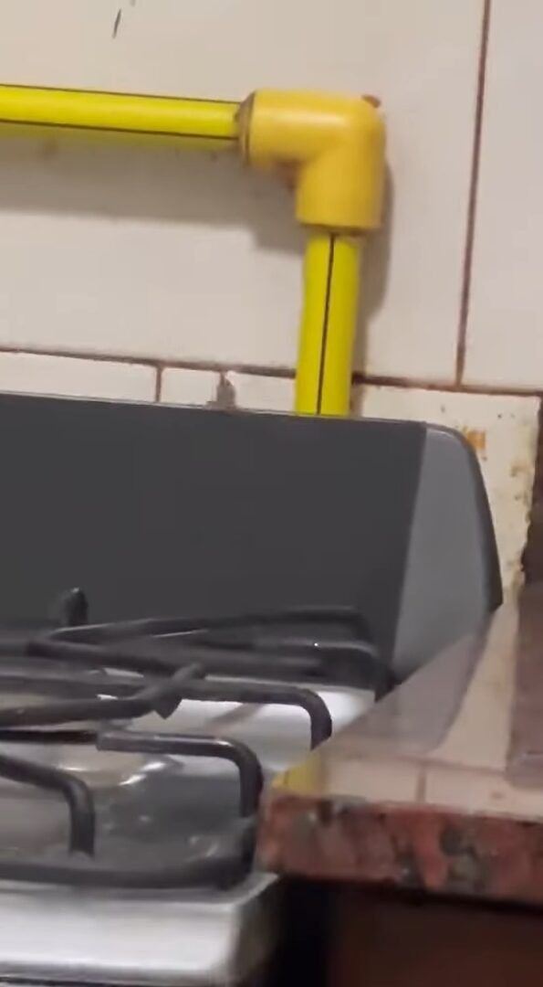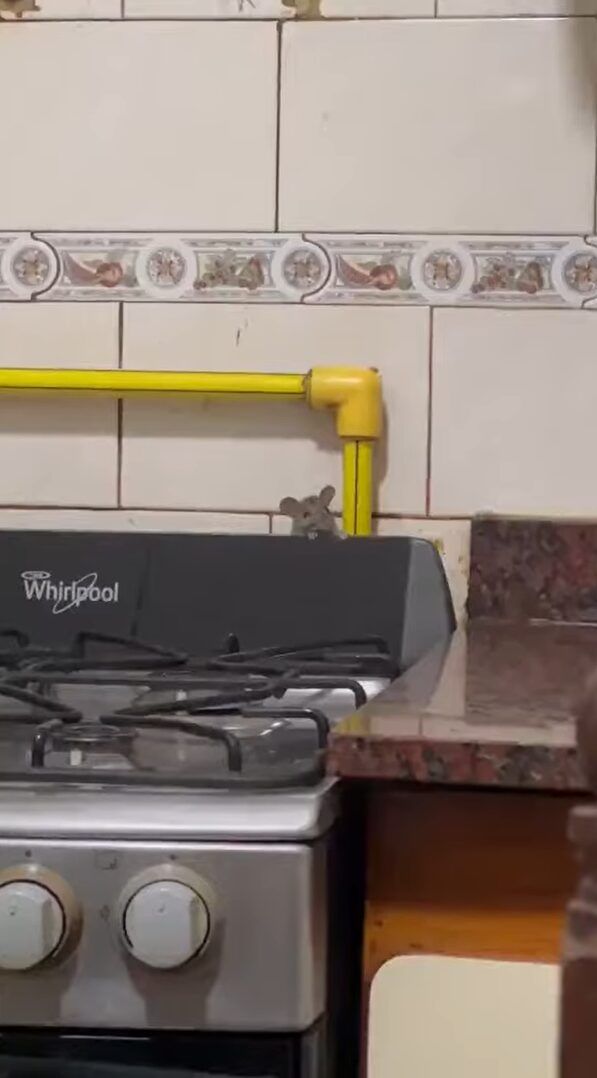 撮影者さんに見つかったことに気が付いたことに驚いたのでしょうか。 ネズミは、ガスコンロの裏にシュッと姿を隠してしまうのでした。