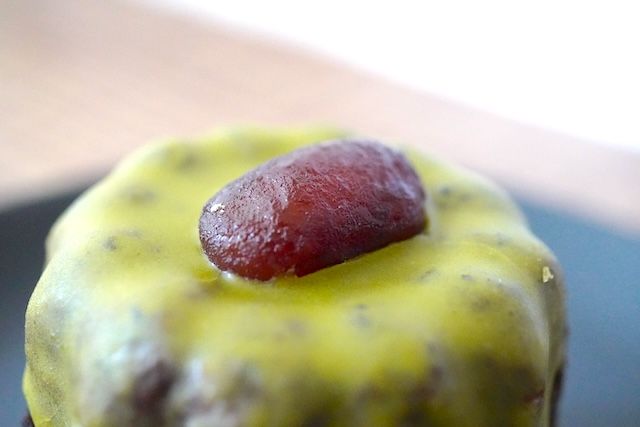てっぺんには金時豆がちょこん。大きめの豆は存在感があって、和の雰囲気をより濃くしてくれます。フランスのお菓子なのに和テイストのデコレーションもよく合っていて不思議。