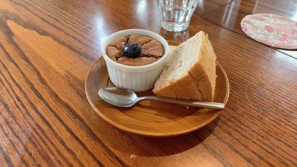 本日のメニューはパンとスープのセット、デザートとドリンクセットがあるとのことで、せっかくなのでどちらも頂きました。この日のスープは黒豆入りのミネストローネだったのですが野菜が沢山入っていて、素材の味が生かされている優しい味で、とても美味しくて心身共に温まりました。デザートはりんごのシフォンケーキとココアチーズケーキが2種類盛り付けらておりとても贅沢で、お味も程よい甘さで美味しかったです。全てのお料理が丁寧に想いを込めて作られているのがわかります。好き嫌いの多い1歳の子供もたくさん食べていました。お席はご年配の夫婦の方と同席だったのですが、いろんなお話をさせていただき、とても楽しいひと時でした。話に夢中になりすぎてしまい、スープとパンの写真を撮るのを忘れてしまいました。来店されるお客さんも優しい方々ばかりで、多くの方から愛されているお店なのだなと感じました。
