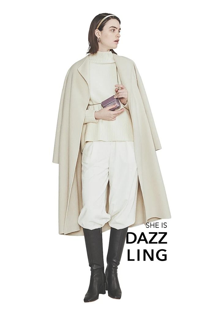 甘さと華やかさのある、小物使いでモノトーンをリード。ベロア素材のカチューシャに、きらめくメタルパーツを配したミニポシェットという、ツヤっぽく華やかな装飾。パンプスで淑女なムードを強調するのではなく、ベージュコートの品のよさに意表をつく重厚な黒小物をセレクト。今季らしいロングブーツをはいて、媚びないスタイルを確立。
